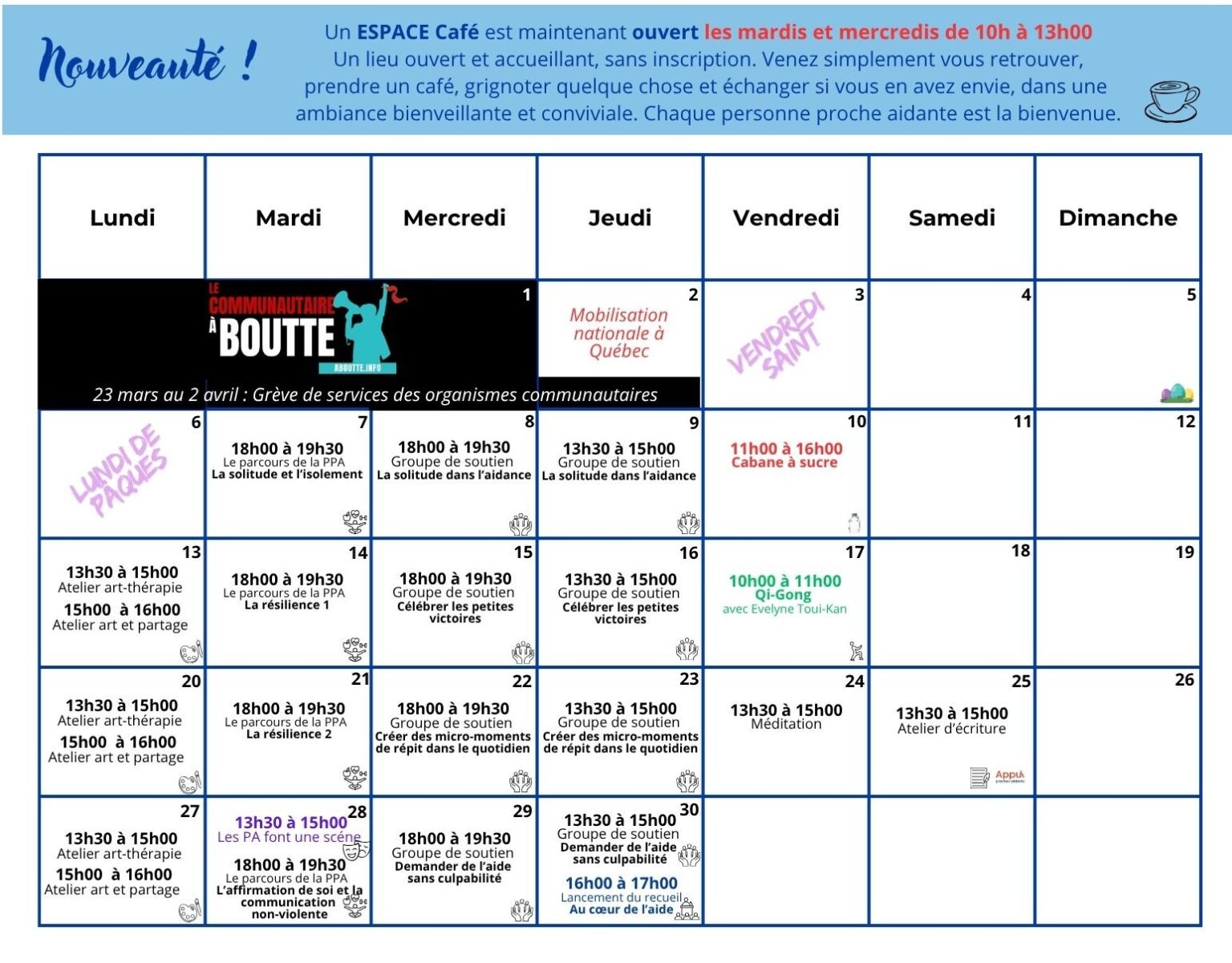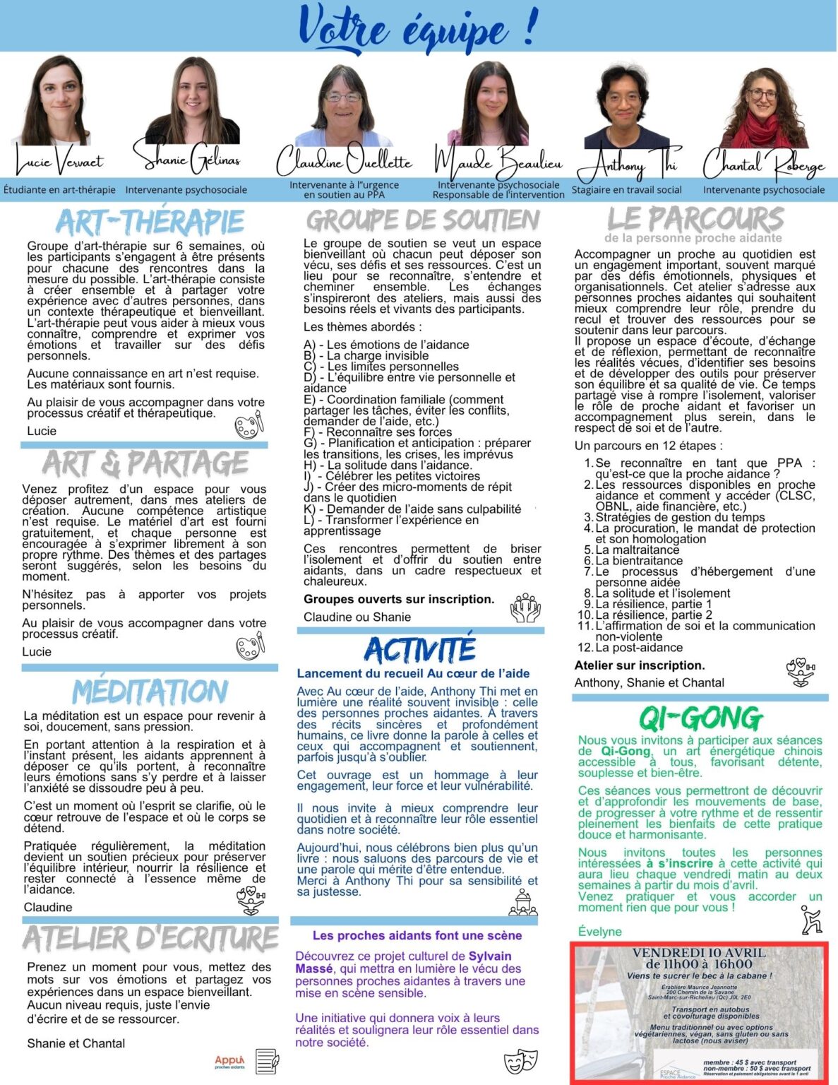 Inscription: activites@espaceprocheaidance.org ou 450-928-0776Nous vous demandons de vous inscrire afin de pouvoir vous rejoindre en cas de changement.Devenir membre Pour faire un don